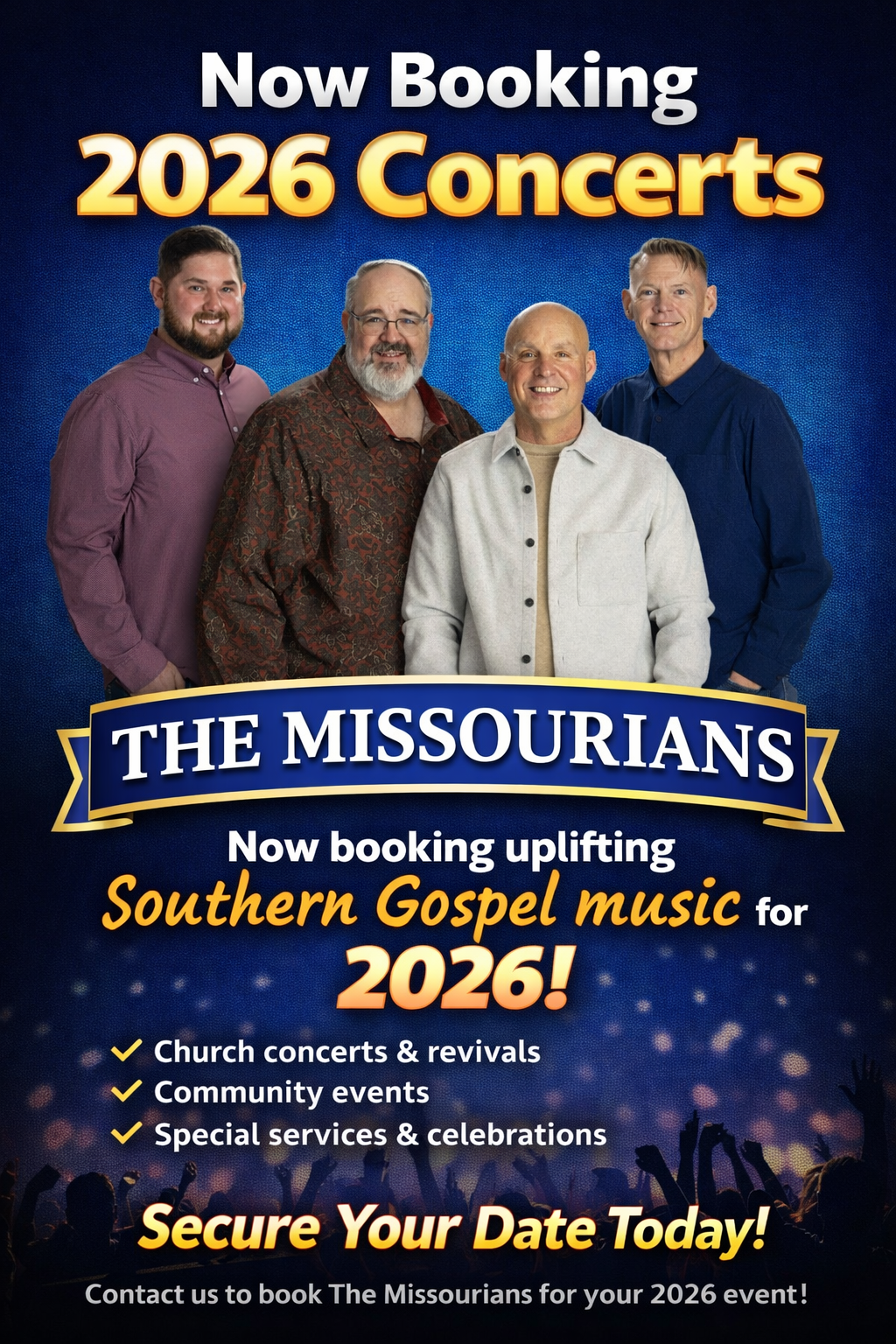BOOKING FOR 2026! SILVER DOLLAR CITY 2025 Looking forward to returning to Silver Dollar City for the 2025 Southern Gospel PicnicAugust 23, 2025Dockside Theatre Make it Now Booking for 2025 and Beyond! If your church or organization is looking to schedule a concert for 2025 and beyond, our tour calendar has several open dates. Please contact us for additional information. ORDER TODAY Our new cd JESUS SAVES is now available in our online store. We now offer digital downloads as well. Check out the NEW apparel in the store! New items have just arrived and are ready to ship. Click Here